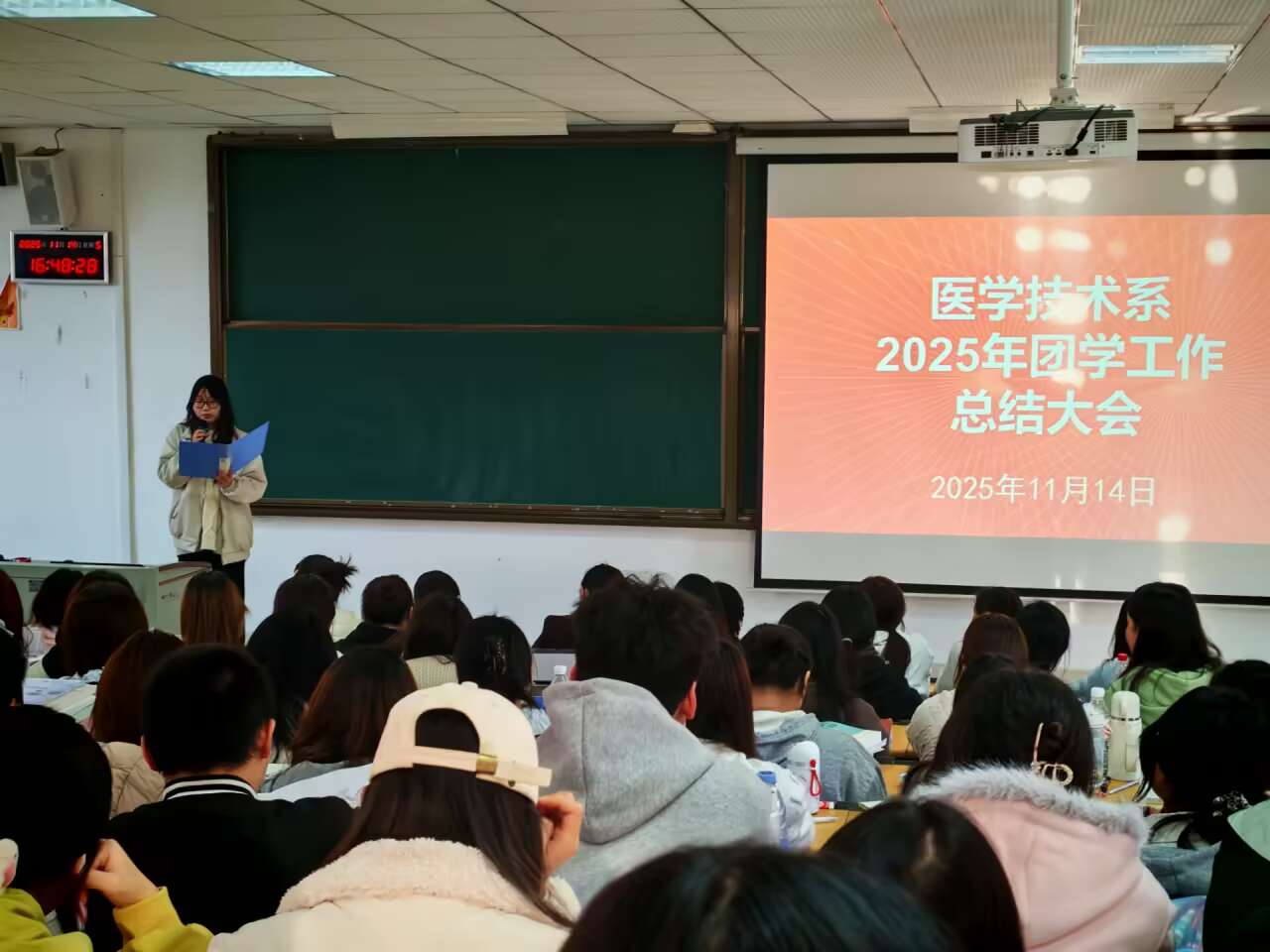 为全面回顾总结2025年团学工作,助力团学工作更好规划未来,医学技术系团总支于2025年11月14日在医技系A301召开2025年团学工作总结大会。医学技术系学生工作办公室(团总支)副主任赵欣、系团学工作负责人何世颖倩及2024级、2025级全体学生组织成员参加本次大会。