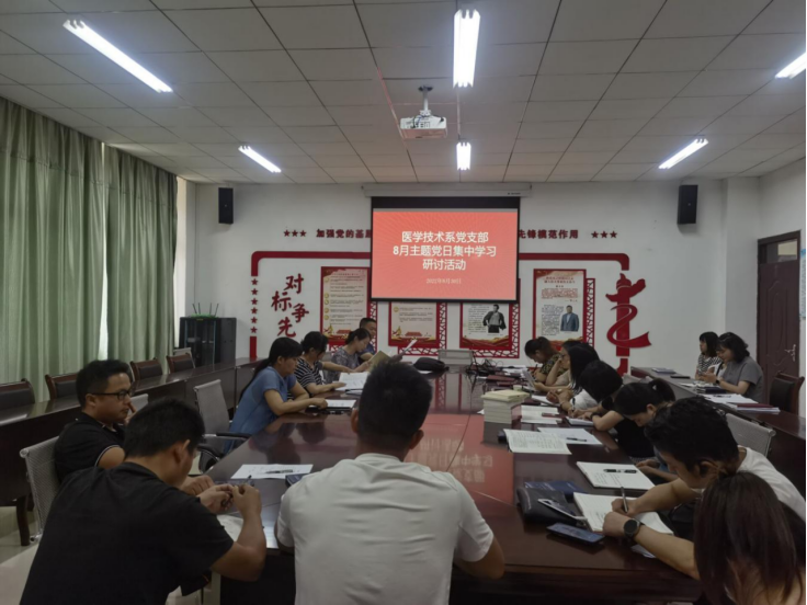 2022年8月30日下午15:00,医学技术系党支部在党员活动室组织全体党员开展2022年8月份主题党日学习活动,活动由支部书记代晖主持。