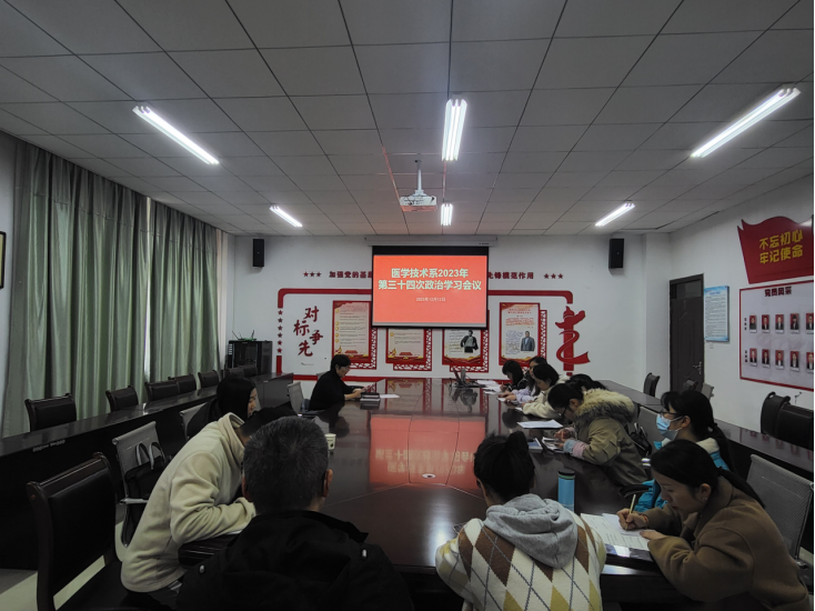 12月12日下午,医学技术系在系部会议室召开本学期第三十四次政治学习会议。会议由系党总支书记董亚云主持,全体教职工参会。