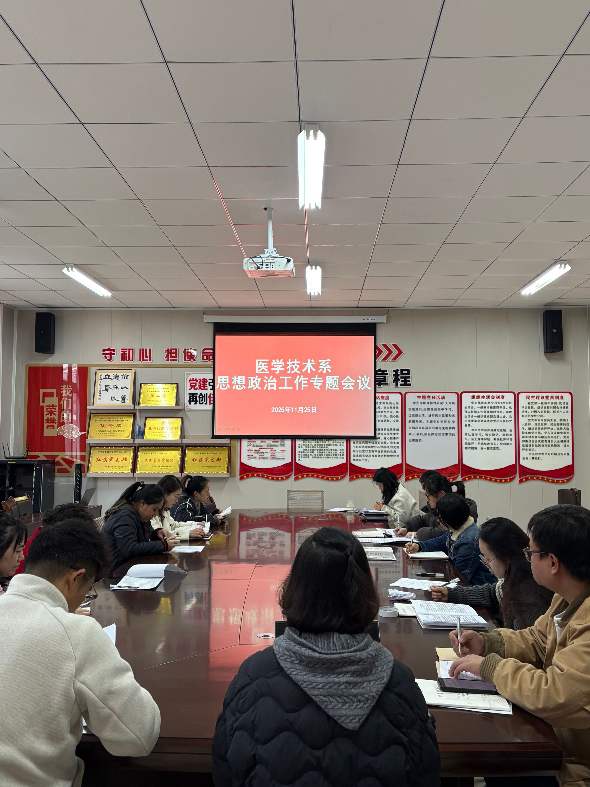 为深入贯彻落实立德树人根本任务,加强和改进新时代思想政治工作,进一步提高医学技术系思想政治工作质量,夯实思想政治工作根基,2025年11月26日,医学技术系召开2025年秋季学期思想政治工作专题会议。会议由系党总支书记代晖主持,全体教师参会。